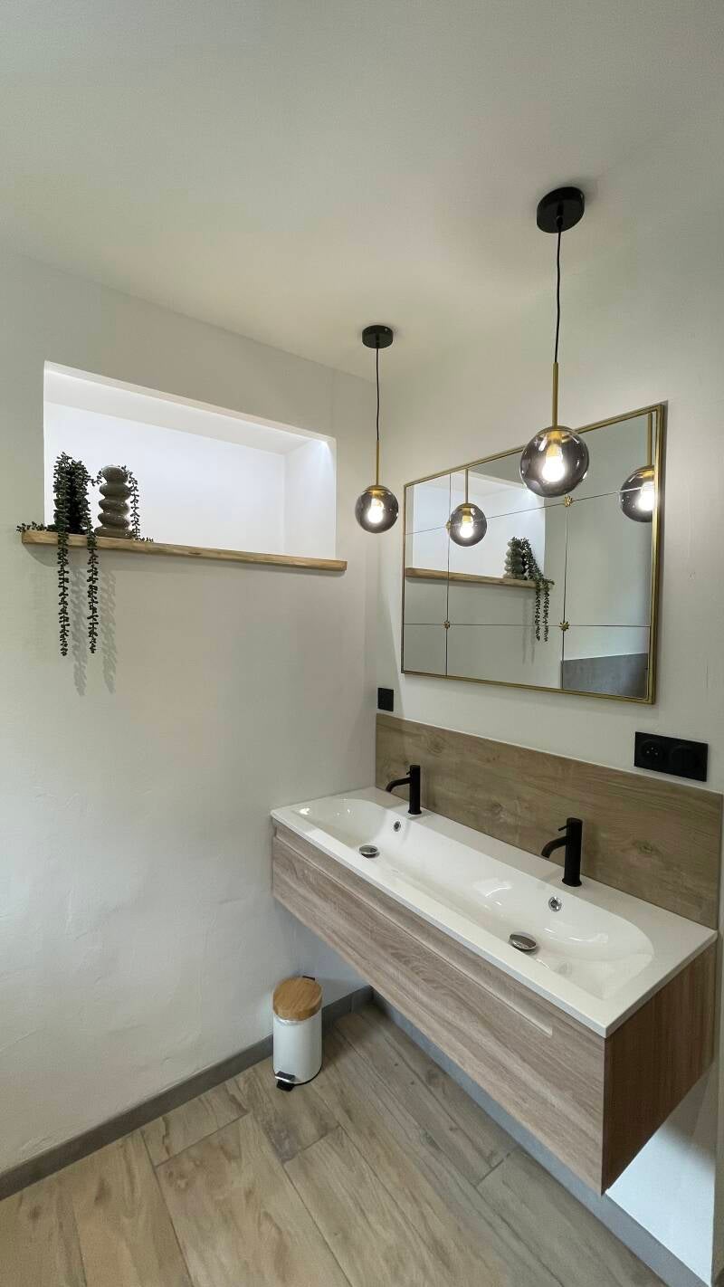 On y retrouve à la fois un mélange de rustique et de moderne. Du gris, du bleu, du moutarde, un beau dégradé de couleurs associées à un mélange de bois, de pierre, de verre…