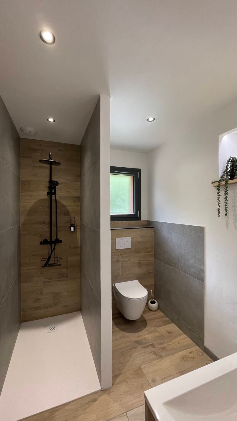Cette chambre possède une salle de bain avec WC ainsi qu'une terrasse privée. Elle est accessible via l’entrée commune de la maison.